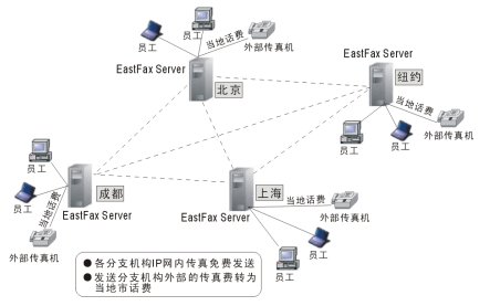 如果集團(tuán)各分支機(jī)構(gòu)都各使用一套EastFax,通過因特網(wǎng)的連接,可將企業(yè)分布在全球或全國(guó)的傳真并入集團(tuán)傳真服務(wù)器系統(tǒng),實(shí)現(xiàn)傳真線路自動(dòng)路由,這樣企業(yè)總部和各分支機(jī)構(gòu)之間的傳真通訊費(fèi)為零,如同內(nèi)部發(fā)送。如發(fā)送系統(tǒng)以外的長(zhǎng)途傳真,本地服務(wù)端智能識(shí)別,將傳真任務(wù)提交到與長(zhǎng)途傳真區(qū)號(hào)相匹配的傳真服務(wù)器上發(fā)送出去,從而將長(zhǎng)途傳真費(fèi)用減少為本地傳真通訊費(fèi)用。此功能節(jié)省了集團(tuán)系統(tǒng)內(nèi)部發(fā)送傳真的費(fèi)用,節(jié)省高額的長(zhǎng)途電話費(fèi)用。適用于多分支機(jī)構(gòu)的集團(tuán)公司。
