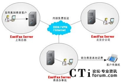 EastFax傳真服務(wù)器的IP-Link集團傳真功能可以徹底解決這一問題,為有多分支機構(gòu)的集團公司實施無紙化傳真,并節(jié)省大量的傳真通訊開支。所謂集團傳真功能,就是將集團內(nèi)處于不同城市的分公司都各自安裝一套EastFax傳真服務(wù)器,通過網(wǎng)絡(luò)將各傳真服務(wù)器連接起來,組建成一個集團傳真網(wǎng)絡(luò)。在這個集團傳真網(wǎng)絡(luò)內(nèi),各分公司的員工之間互發(fā)傳真就可以通過網(wǎng)絡(luò)進行免費傳輸;若發(fā)送集團外部的傳真,則通過最低費用路由的功能,將傳真自動路由到離目的地最近的服務(wù)器發(fā)送,將長途話費轉(zhuǎn)為本地的市話費,從而達到節(jié)省集團傳真通訊費用的目的。