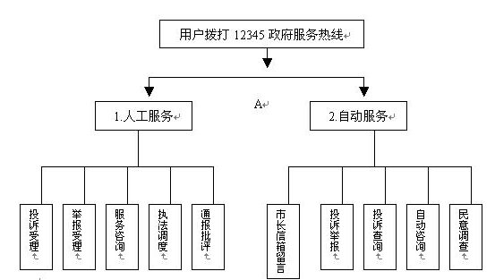 當(dāng)用戶撥通"12345"電話并選擇自動(dòng)服務(wù)時(shí),聲訊臺自動(dòng)播放引導(dǎo)語"選擇市長信箱留言請按1,自動(dòng)投訴舉報(bào)請按2,投訴查詢請按3,服務(wù)咨詢請按4,民意調(diào)查請按5。