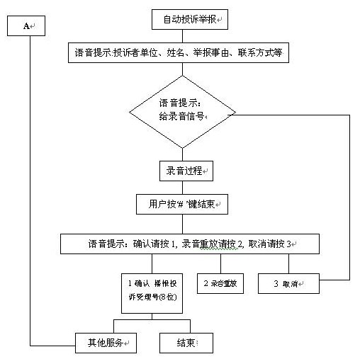 群眾通過自動(dòng)臺按照語音提示進(jìn)行投訴、舉報(bào)選擇錄音。自動(dòng)投訴舉報(bào)錄音流程如下: