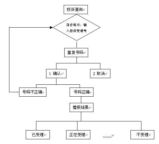 通過自動(dòng)臺,輸入自己的投訴序號查詢投訴處理結(jié)果,自動(dòng)投訴處理結(jié)果查詢流程如下: