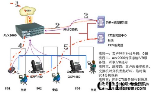 在方案中外線呼入IPPBX,IPPBX根據(jù)呼入路由指向特定rtsp號碼,rtsp根據(jù)配置引導(dǎo)IVR服務(wù)器開始播放語音,客戶根據(jù)語音提示按鍵轉(zhuǎn)接坐席、傳真或自動語音應(yīng)答等;坐席接聽時同時屏幕彈出CRM中關(guān)于該來電號碼的相關(guān)信息,使坐席能做針對性的應(yīng)答和服務(wù),同時記錄報表數(shù)據(jù)供查詢。