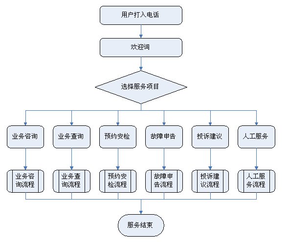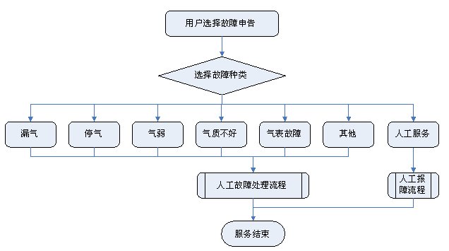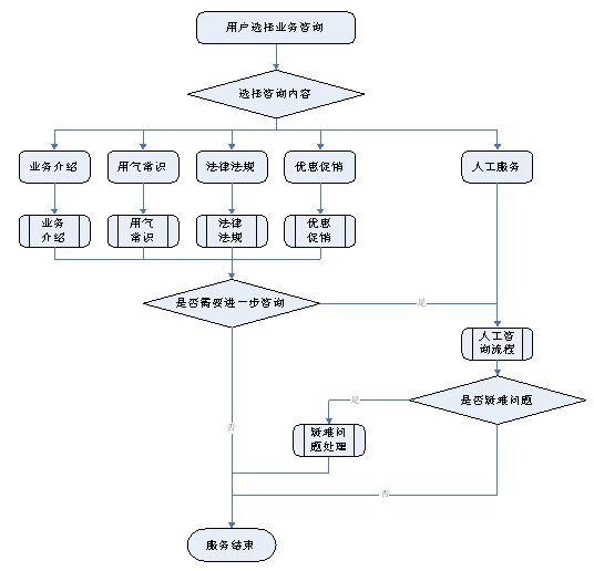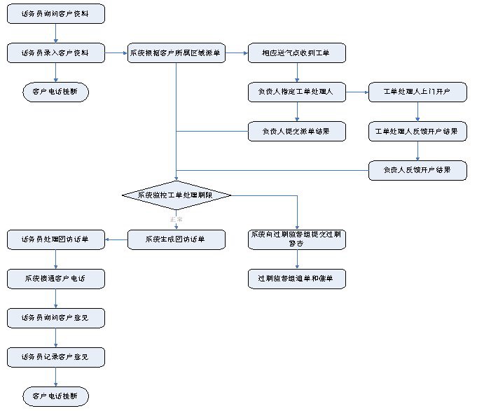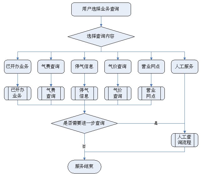 1)業(yè)務(wù)咨詢:用戶通過人工、自動語音等方式咨詢有關(guān)政策法規(guī)、資費標準、用氣常識、報裝方法等,系統(tǒng)以語音、傳真、Email、短消息等方式回復(fù)客戶。