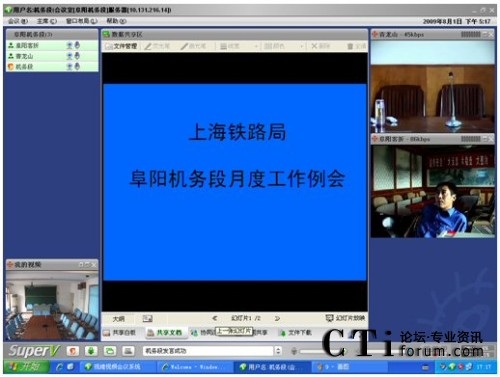 CTI論壇(ctiforum)08月06日消息: 日前,京九干線主力機(jī)務(wù)段——上海鐵路局阜陽(yáng)機(jī)務(wù)段成功啟動(dòng)視維Super-V視頻會(huì)議系統(tǒng)。阜陽(yáng)機(jī)務(wù)段的領(lǐng)導(dǎo)和職工,每天早上8點(diǎn)上班后,第一件事情就是登陸視頻會(huì)議系統(tǒng),匯報(bào)前日工作情況、部署當(dāng)日工作內(nèi)容。已然,山大聯(lián)潤(rùn)為上海路局阜陽(yáng)機(jī)務(wù)段部署的阜陽(yáng)機(jī)務(wù)段視頻會(huì)議系統(tǒng),成為鐵路部門必不可少的遠(yuǎn)程溝通交流工具,在有效提高鐵路系統(tǒng)溝通效率的同時(shí),保障了鐵路運(yùn)輸?shù)陌踩,極大滿足了鐵路部門暑期運(yùn)營(yíng)業(yè)務(wù)對(duì)溝通和會(huì)議的需求。