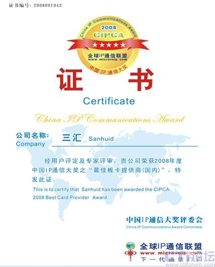9月19日,在上海盛大舉行的CIPCC中國IP通信大會上,杭州三匯摘取了CIPCA 2008年國內(nèi)最佳語音板卡提供商大獎,體現(xiàn)了杭州三匯在國內(nèi)語音卡領(lǐng)域的絕對領(lǐng)導(dǎo)和優(yōu)勢地位。CTI論壇編輯