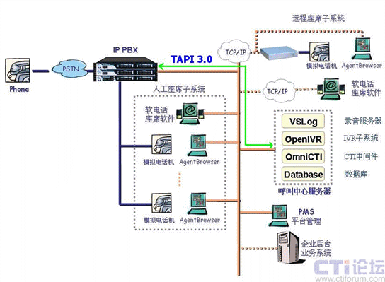 那么如何利用TAPI技術(shù)構(gòu)建現(xiàn)代呼叫中心呢?傳統(tǒng)呼叫中心的做法是每個(gè)坐席配一部電話。而采用TAPI 3.0技術(shù),完全不需要每個(gè)座席再配一部電話,我們只需一臺(tái)電腦終端,配以PC麥克風(fēng)和耳機(jī)即可為客戶(hù)服務(wù),因?yàn)楫?dāng)普通電話呼叫轉(zhuǎn)到座席時(shí),語(yǔ)音是經(jīng)過(guò)轉(zhuǎn)換壓縮為IP包進(jìn)行收發(fā)的。我們可以利用TAPI技術(shù)提供的全套API標(biāo)準(zhǔn)函數(shù)來(lái)控制CTI的硬件,包括IPPBX或者板卡,來(lái)實(shí)現(xiàn)這種模式的呼叫中心,并且實(shí)現(xiàn)簡(jiǎn)單,比較適合在原有系統(tǒng)上的升級(jí)換代。
