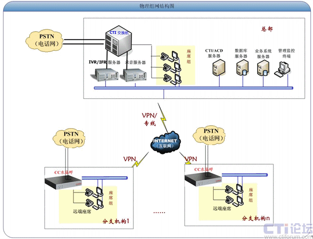 BasicCall和CrystalCall的聯(lián)網(wǎng)應(yīng)用多出現(xiàn)在總部和分支機(jī)構(gòu)中。在中心總部建設(shè)一套強(qiáng)大的呼叫中心系統(tǒng),在分支結(jié)構(gòu)建設(shè)獨(dú)立的呼叫中心系統(tǒng),中心與各分支結(jié)構(gòu)之間聯(lián)網(wǎng),中心能夠?qū)Ω鞣种ЫY(jié)構(gòu)的數(shù)據(jù)進(jìn)行統(tǒng)一的監(jiān)控和管理。同時(shí)分支結(jié)構(gòu)能夠?qū)χ苯訐艽虮痉⻊?wù)電話的客戶進(jìn)行統(tǒng)一的管理,把所有的電話都納入呼叫中心的范疇,統(tǒng)一提供服務(wù)。實(shí)現(xiàn)總部和中心之間的“松散建設(shè)、緊密管理”。圖 呼叫中心系統(tǒng)物理拓?fù)鋱D