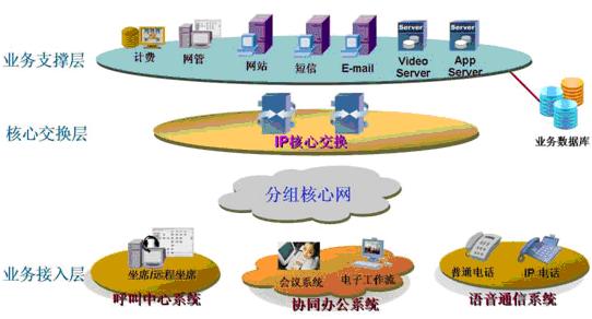 業(yè)務(wù)支撐層:計費(fèi)、網(wǎng)管、多媒體視頻、應(yīng)用服務(wù)器等各種功能服務(wù)器?膳c用戶的業(yè)務(wù)數(shù)據(jù)庫對接,為整個業(yè)務(wù)提供有力的支撐平臺。確保有效快速的處理呼叫流程、提高工作效率,評估呼叫中心的表現(xiàn)。
