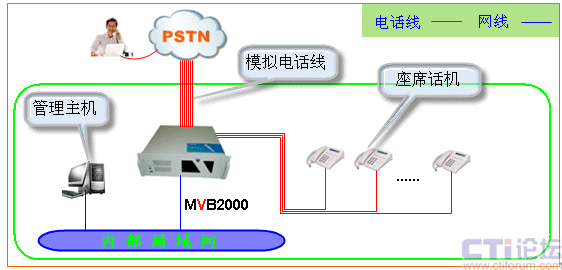 用電話線將座席電話機(jī)與MVB2000相連,將電話線插到MVB2000的FXS接口卡的對(duì)應(yīng)接口;