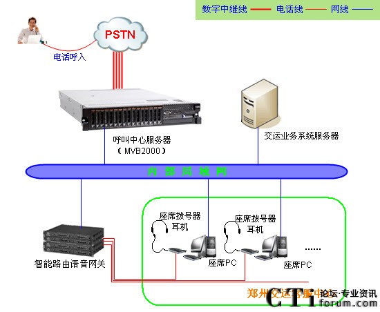 鄭州交通運輸集團有限責(zé)任公司,是河南省規(guī)模最大的道路運輸企業(yè),目前有員工8300多人,企業(yè)總資產(chǎn)15億元。是一家集公路客貨運輸、現(xiàn)代物流、出租車運輸、汽車貿(mào)易、汽車維修、房地產(chǎn)開發(fā)、旅游旅棧餐飲、燃潤料和汽車配件銷售、商品批發(fā)、印刷業(yè)、信息傳媒業(yè)、駕駛員培訓(xùn)、投資建設(shè)、物業(yè)管理等多元化經(jīng)營為一體的大型企業(yè)集團。鄭州交運服務(wù)熱線采用暢信達通信MVB2000系統(tǒng)作為交換平臺,采用企業(yè)級智能路由語音網(wǎng)關(guān)結(jié)合話機作為座席終端,系統(tǒng)共接入數(shù)字中繼線4條(4E1),座席分機90臺,系統(tǒng)通過內(nèi)部局域網(wǎng)組網(wǎng),系統(tǒng)架構(gòu)形式如下: