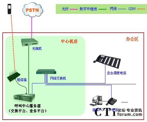 維佳元創(chuàng)呼叫中心系統(tǒng)采用暢信達通信呼叫中心交換平臺與業(yè)務平臺,采用1路E1數字中繼線接入,對外公布一個400號碼與10多個辦公電話號碼,采用IP話機作為總臺調度電話、座席電話與辦公電話,系統(tǒng)架構形式如下: