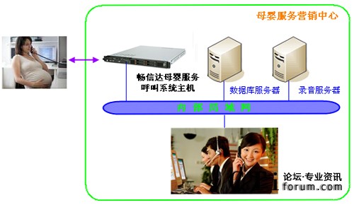 暢信達母嬰服務呼叫系統(tǒng)是以母嬰服務呼叫系統(tǒng)主機為呼叫交換和業(yè)務受理平臺,選配數(shù)據(jù)庫服務器和錄音服務器,采用人工座席發(fā)起呼叫并接聽來電,系統(tǒng)架構(gòu)圖如下: