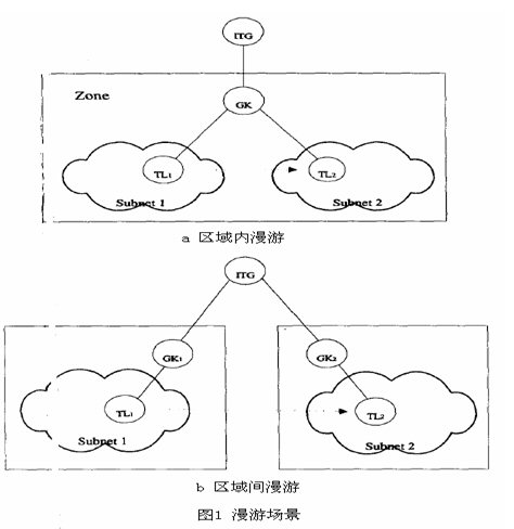 H.323定義中,區(qū)域指由H.323實(shí)體(終端、ITG、MCU)組成的集合,并由一個(gè)網(wǎng)守進(jìn)行管理。每一個(gè)區(qū)域只有一個(gè)網(wǎng)守,但允許多個(gè)子網(wǎng)通過(guò)路由器連接進(jìn)來(lái)。對(duì)于這種多子網(wǎng)單網(wǎng)守的特性,我們發(fā)現(xiàn)這與GSM系統(tǒng)中的服務(wù)區(qū)類(lèi)似,網(wǎng)守就相關(guān)于HLR或者VLR。服務(wù)區(qū)中有移動(dòng)電話(huà)終端和代理管理下的基站,類(lèi)似的一個(gè)區(qū)域中有多個(gè)子網(wǎng)并都在一個(gè)網(wǎng)守的管理下。當(dāng)移動(dòng)IP電話(huà)從一個(gè)子網(wǎng)漫游到另外一個(gè)子網(wǎng)時(shí),IP電話(huà)的IP地址就發(fā)生了變化。如果不做移交處理的話(huà),連接將中斷。