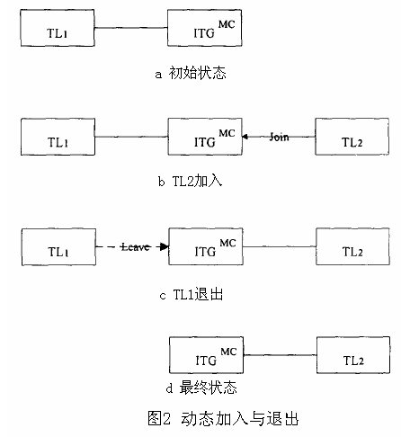 hoc多點(diǎn)會(huì)議的動(dòng)態(tài)加入與退出是等價(jià)的。圖3(a)說(shuō)明了ITG與TL1通信時(shí)的漫游。圖2(b)說(shuō)明了子網(wǎng)1向子網(wǎng)2的移交處理。圖2(c)說(shuō)明了在移交處理結(jié)束后ITG與TL1連接的中斷。最后,移交處理成功完成,只剩下ITG與TL2的連接,如圖2(d)所示。