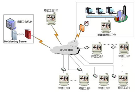 新疆建設(shè)兵團(tuán)工會(huì)下設(shè)有14個(gè)師工會(huì),111個(gè)團(tuán)場(chǎng)工會(huì).共有200個(gè)用戶同時(shí)參加視頻會(huì)議。中心服務(wù)器帶寬為100M光纖,各地終端通過(guò)網(wǎng)通2M寬帶接入,每個(gè)師、團(tuán)級(jí)會(huì)場(chǎng)都有自己獨(dú)立的機(jī)房和會(huì)議室,適合進(jìn)行基于IP網(wǎng)絡(luò)視訊會(huì)議的應(yīng)用,在這個(gè)網(wǎng)絡(luò)平臺(tái)上,優(yōu)視(URSACOM)HotMeeting富媒體視頻會(huì)議系統(tǒng)所提供的高質(zhì)量的視頻圖像和方便易用的文檔、文件共享功能,使得兵團(tuán)工會(huì)領(lǐng)導(dǎo)能夠在這個(gè)平臺(tái)上進(jìn)行從桌面討論到會(huì)議室正式會(huì)議等各種規(guī)模應(yīng)用。通過(guò)HotMeeting富媒體視頻會(huì)議系統(tǒng),除了進(jìn)行全團(tuán)工會(huì)系統(tǒng)例會(huì),工作交流等常見(jiàn)的應(yīng)用之外,遠(yuǎn)程培訓(xùn)等也是經(jīng)常進(jìn)行的內(nèi)容。各個(gè)師、團(tuán)工會(huì)系統(tǒng)能利用數(shù)據(jù)功能和兵團(tuán)總工會(huì)協(xié)調(diào)業(yè)務(wù),也能把平常培訓(xùn)的會(huì)議材料進(jìn)行詳細(xì)介紹,節(jié)約了以前培訓(xùn)所花費(fèi)的大量精力和時(shí)間。具體網(wǎng)絡(luò)拓?fù)湟?jiàn)下圖: