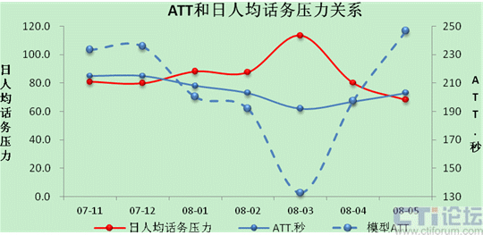 筆者在《話務(wù)壓力模型及其應(yīng)用》一文中量化分析了日人均話務(wù)壓力(通話強度)對ATT的量化影響,建立了一個話務(wù)壓力模型,闡述了ATT、質(zhì)量、效率之間的辯證關(guān)系,并進一步說明了如何應(yīng)用該模型評估ATT的合理波動范圍、進行人員招聘和排班的測算。