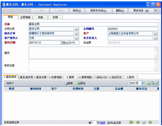 服務合同是也分為兩種,一種是非公司項目的服務請求此時沒有與訂單關聯(lián);二種是公司項目后服務請求,此時可以關聯(lián)訂單也可以不關聯(lián)訂單,如果關聯(lián)訂單就可以將訂單產品明細導入合同明細中(導入明細是可以調整數(shù)量和價格的).