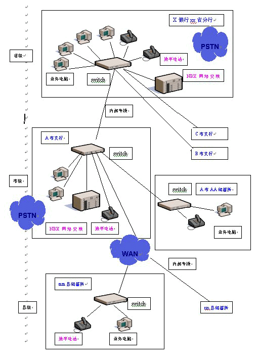 在銀行的省、市級分行分別部署一臺NBX網(wǎng)絡(luò)交換機(jī)——只需通過接入銀行系統(tǒng)內(nèi)部局域網(wǎng),經(jīng)過簡單的配置即可使用。然后根據(jù)需要,在市內(nèi)各個(gè)儲蓄所、各縣級儲蓄所配置相應(yīng)數(shù)量的數(shù)字話機(jī),那么在全省內(nèi)各個(gè)縣市區(qū)的各個(gè)營業(yè)網(wǎng)點(diǎn)之間,上下級之間就都可以使用數(shù)字電話機(jī)通過數(shù)據(jù)網(wǎng)免費(fèi)撥打語音電話。