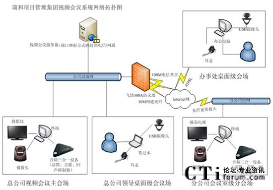 瑞和項目管理集團網(wǎng)絡(luò)基礎(chǔ)建設(shè)以后,各個分支機構(gòu)通過ADSL接入到互聯(lián)網(wǎng),一般每個分支單位大約5人左右,負責(zé)1個省的業(yè)務(wù)。在現(xiàn)有的網(wǎng)絡(luò)基礎(chǔ)上構(gòu)建了XView迅流視頻系統(tǒng),來滿足各地之間的溝通需求,系統(tǒng)的大范圍使用大大的提高辦公效率,節(jié)省時間及會議成本。隨著各部門遠程通信需求日益增多,充分發(fā)揮現(xiàn)有網(wǎng)絡(luò)優(yōu)勢,根據(jù)瑞和項目管理集團實際規(guī)模,對XView迅流視頻會議系統(tǒng)進行擴容到全國50個重點分支,改造以后XView迅流視頻會議系統(tǒng)作為公司主要通訊手段。實現(xiàn)各個分公司、辦事處充分應(yīng)用網(wǎng)絡(luò)視頻會議系統(tǒng)進行音頻、視頻和數(shù)據(jù)的多方溝通,提高辦公效率。