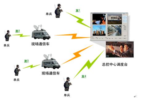 在具體應(yīng)用中,工作人員(士兵)攜帶單兵背負(fù)終端深入現(xiàn)場(災(zāi)區(qū)、廣場、戰(zhàn)場等),將現(xiàn)場視頻實時回傳到后方的應(yīng)急通信車或指揮中心,同時現(xiàn)場人員可以和指揮中心建立雙向語音通信,指揮中心根據(jù)現(xiàn)場真實的視頻信息并結(jié)合現(xiàn)場人員語音匯報,可以做出更有針對性、更具準(zhǔn)確性的指揮決策。