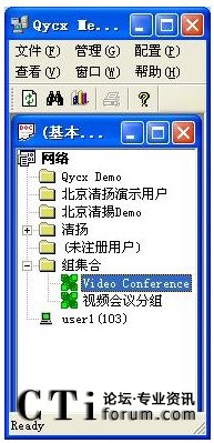 系統(tǒng)已經(jīng)默認(rèn)將這三個賬戶加入了分組。如上圖所示。 這樣客戶端運行起來以后就可以發(fā)起視頻會議進(jìn)行視頻會議了,不需要再在服務(wù)器端進(jìn)行任何操作。這三個賬戶可以隨意的更改密碼、如果不想使用這三個賬戶名,可以刪除重新建立賬戶名,除此以外,還可以建立新的賬戶,并加入分組。這些操作都是在服務(wù)器端進(jìn)行的。詳細(xì)的操作請參看用戶手冊或者是FLASH教程。有了用戶名和密碼以后,無論走到哪里,使用任意一臺電腦登錄自己的帳號,就可以參加會議,這樣就無需服務(wù)器端總是臨時變更組成員。