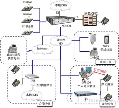 整個(gè)系統(tǒng)內(nèi)部通過主流標(biāo)準(zhǔn)協(xié)議聯(lián)結(jié),支持與運(yùn)營商IMS網(wǎng)絡(luò)的無縫對(duì)接。新增分支機(jī)構(gòu)只需增加NC5200系列IP-PBX或者IAD即可融入公司整個(gè)通信系統(tǒng)。