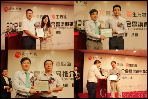 抽獎(jiǎng)結(jié)束后,強(qiáng)總、孫總、許總為震有科技的合作代理商授牌,授牌儀式隆重而熱烈。