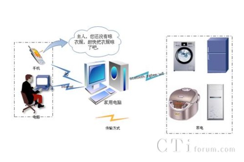 家電遠控系統(tǒng)的原理是利用電腦或者手機的電源管理系統(tǒng),來管理用戶終端軟件管理電源的開關、定時、預設時間等,利用互聯(lián)網或者手機網絡把信號傳輸到家庭電腦,家庭電腦當作小型服務器或者信號轉發(fā)點,把信號利用藍牙、zigbee、wifi等無線傳輸到指定的電源插座,當然每個電源插座都要有相應的信號接收模塊實現和家庭電腦的信號傳輸,實現了對電源的管理功能。家電遠控終端軟件嵌入語音合成軟件,利用合成語音報讀預設的提醒內容和時間提醒,具有危急情況下的報警功能。當然如果我們是在家里,可以直接用手機通過藍牙對電源插座進行管理,或者通過家庭電腦進行管理。如圖所示: