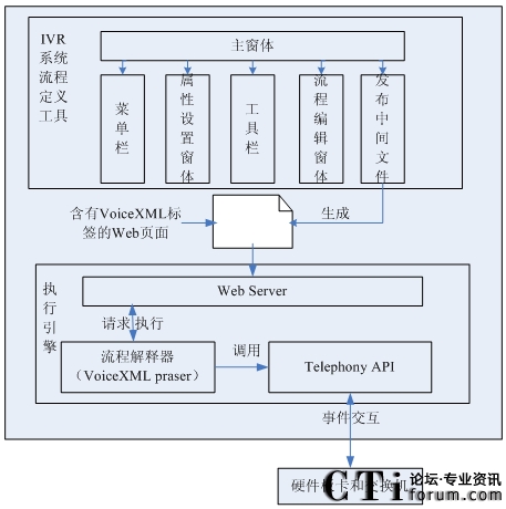 交互式語音應答(IVR)系統(tǒng)是電話銀行呼叫中心系統(tǒng)的最前端,它的質量直接影響整個系統(tǒng)的穩(wěn)定性和可擴展性。本文設計的IVR系統(tǒng)主要分為兩個模塊:可視化過程定義工具(用戶交互接口)、流程執(zhí)行引擎。由于過程定義工具主要是面向用戶,它的設計規(guī)范首先要符合流程的定義規(guī)則,反應到本文中即流程工具涉及到的節(jié)點類型均符合IVR的操作動作和相關的業(yè)務動作,同時還要生成符合流程執(zhí)行引擎能處理的文件格式。在流程執(zhí)行引擎方面,符合VoiceXML的設計框架,將Web應用和語音應用相結合。圖3.1 IVR系統(tǒng)整體結構圖