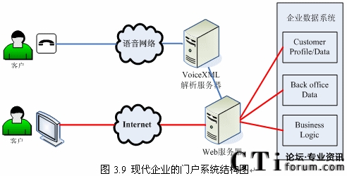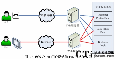 隨著Internet和Web技術的迅速發(fā)展,越來的企業(yè)開始建立自己的門戶網(wǎng)站,同時又擁有自己的IVR系統(tǒng)(如圖3.8所示),但是兩套系統(tǒng)完全獨立,語音系統(tǒng)和數(shù)據(jù)系統(tǒng)沒有任何交互或者只有很少的交互。而建立IVR系統(tǒng)的目標就是給客戶更好的體驗,使客戶能方便的通過電話完成更多以前需要登陸企業(yè)門戶網(wǎng)站,或者親自去企業(yè)或其網(wǎng)點去辦理的業(yè)務,這就需要IVR系統(tǒng)能跟后臺數(shù)據(jù)系統(tǒng)有更多更好的交互!罢Z音門戶”的概念出現(xiàn)也愈發(fā)的證明這一點。