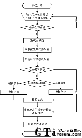 根據(jù)流程圖,使用者在進入系統(tǒng)時需要輸入用戶名和密碼以及要連接的ODS數(shù)據(jù)源的IP和端口。如果信息正確,則進入到報表系統(tǒng)主界面。然后報表設(shè)計工具會從配置數(shù)據(jù)庫中讀取報表模板配置,再將現(xiàn)在統(tǒng)計數(shù)據(jù)的報表模板信息展現(xiàn)出來。