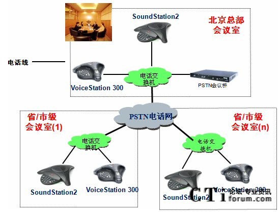 根據客戶的要求,本著“完善、經濟、高效”的原則,我們制定了以下解決方案;系統(tǒng)利用傳統(tǒng)電話網絡,擁有自己的會議管理系統(tǒng);北京總部方面使用Polycom SS2基本型商務會議電話;各個省/市級分會場,根據自己會場的情況自選設備;