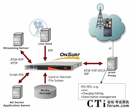 流媒體服務(wù)器(OnSurf) 使用RSTP等實時傳輸協(xié)議與客戶端進(jìn)行媒體服務(wù)協(xié)商,向用戶發(fā)送媒體流,服務(wù)器同時包含語音和視頻轉(zhuǎn)碼器,用于各種音視頻媒體格式的轉(zhuǎn)換。