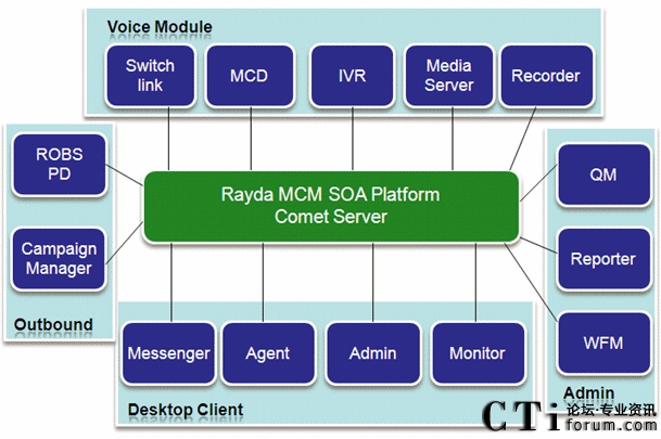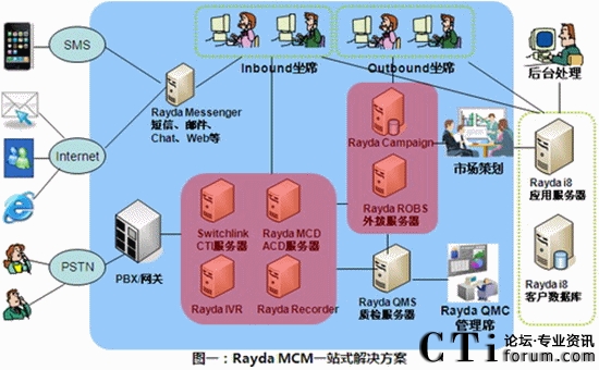 Rayda MCM多渠道呼叫管理平臺,是呼叫中心基礎(chǔ)呼叫業(yè)務(wù)的信息化支撐平臺系統(tǒng)。Rayda MCM以先進的呼叫信息交互為核心,涵蓋呼叫中心系統(tǒng)所必須的ACD、IVR、PD、錄音、質(zhì)檢等基本功能,更整合了統(tǒng)一通信、電話營銷等多項企業(yè)迫切需要的功能。MCM支持支持從板卡、傳統(tǒng)PBX到IPPBX網(wǎng)絡(luò)等各種接入方式的建設(shè),支持從單點到分布式等各種組網(wǎng)方式,適應(yīng)從中小企業(yè)到外包型等各種規(guī)模呼叫中心的需求。