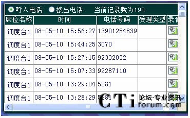 當電話打進來,話務(wù)員提話機時系統(tǒng)便自動進行錄音,系統(tǒng)把語音信號以數(shù)字化語音格式寫入硬盤。同時系統(tǒng)記錄其通話日期、摘機時間、掛機時間和當前通話時間等信息,如果該次電話為打出電話,還可記錄其打出的電話號碼。當值班人員掛機時系統(tǒng)便會自動停止錄音。