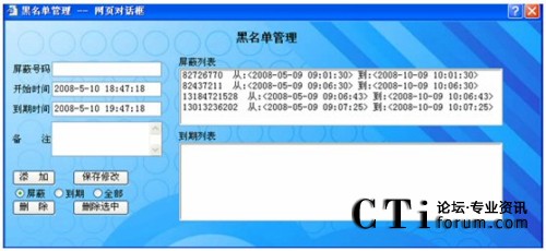 可以將多次惡意騷擾、誤撥的電話,加入到黑名單中,可設(shè)定鎖定時限,并可查詢管理屏蔽列表和過期列表。