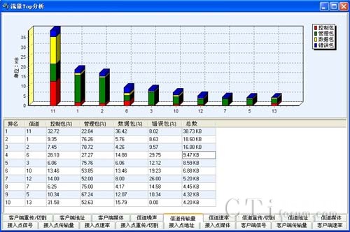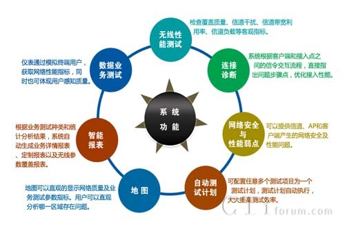 該系統(tǒng)能夠向用戶提供豐富的802.11 a/b/g/n無線參數(shù),包括信號強度覆蓋參數(shù),同頻干擾及鄰頻干擾參數(shù),管理幀、控制幀、數(shù)據幀及各種無線幀傳輸速率的統(tǒng)計參數(shù)等;系統(tǒng)能基于以上各類統(tǒng)計參數(shù),并通過實時進行各種數(shù)據業(yè)務測試,獲取網絡的數(shù)據業(yè)務參數(shù)指標,分析WLAN網絡質量問題。