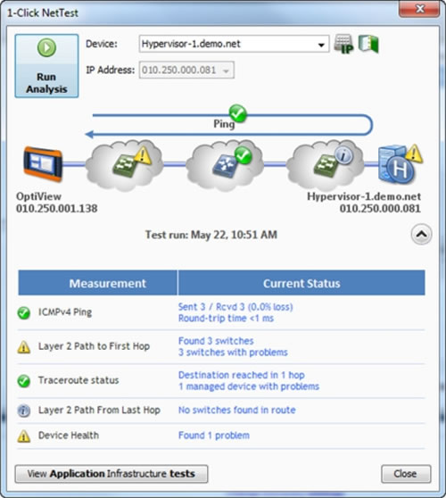 OptiView XG v8 具備兩種新的故障排除功能:一鍵 NetTest 和自動多段分析,能夠迅速確定數據路徑以及隔離出物理和虛擬網絡中的問題。只需按一下按鍵,一鍵 NetTest 就能找出單個屏幕視圖里的連接路徑。