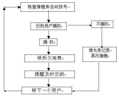 。。催費(fèi)工作是由指定的欠費(fèi)數(shù)據(jù)文件(或欠費(fèi)數(shù)據(jù)庫)中提取用戶電話號(hào)碼和欠費(fèi)金額,自動(dòng)順序向各欠費(fèi)用戶撥號(hào),撥通后自動(dòng)播放催費(fèi)通知并通報(bào)欠費(fèi)金額數(shù)。系統(tǒng)自動(dòng)統(tǒng)計(jì)通話結(jié)果,系統(tǒng)對(duì)未應(yīng)答用戶會(huì)自動(dòng)重復(fù)多次撥叫。