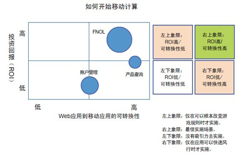 建議考察兩個基本維度:(1)第一個移動項目的總投資回報(ROI)和價值主張是什么?(2)現(xiàn)有的Web應用如何通過相對較少的努力就可以轉(zhuǎn)變成移動應用?在下面的圖表中這兩個維度被標為X軸和Y軸。氣泡的大小代表投入的大小。很顯然,右上方的象限是容易摘取的果子。您選擇哪個氣泡關鍵在于您對風險的偏好以及在市場中成為領先者的渴望。
