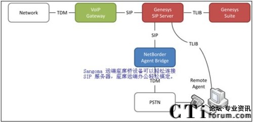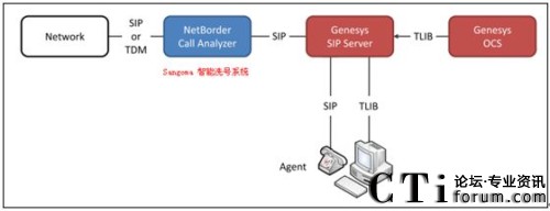 呼叫中心的蓬勃發(fā)展帶動(dòng)了呼叫中心廠家投入巨資開發(fā)呼叫中心最核心的功能,例如拓展呼叫中心的接入,座席的管理,洗號(hào)系統(tǒng)。除了支持Asterisk,F(xiàn)reeswitch平臺(tái)的高并發(fā)A116 16E1做為高并發(fā)呼叫中心以外,Sangoma早在2004 年就開始和世界知名呼叫中心廠家Genesys 合作,開發(fā)了呼叫中心的洗號(hào)系統(tǒng),遠(yuǎn)端座席管理,PSTN 接入等強(qiáng)大的工具,從而提高了大型呼叫中心的接通率和座席管理的靈活性。Sangoma 通過genesys 兼容性測(cè)試,完全兼容Genesys 呼叫中心平臺(tái)。NetBorder 系統(tǒng)架構(gòu)如下:CTI論壇報(bào)道