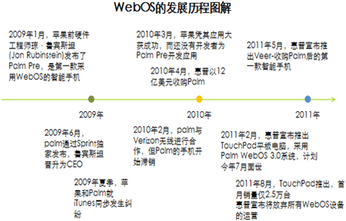 從WebOS的發(fā)展歷程看,惠普收購Palm后,1年之后才推出一款新的智能手機(jī),今年8月才推出了首款平板電腦TouchPad.而TouchPad的月銷量不佳成為導(dǎo)火索,惠普最終決定放棄所有WebOS設(shè)備的運(yùn)營。