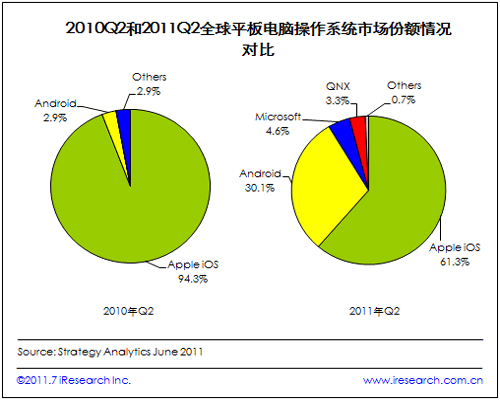 從平板電腦操作系統(tǒng)出發(fā),根據(jù)Strategy Analysis發(fā)布的數(shù)據(jù),2011Q2iOS的市場占比最大,為61.3%,其次為Android,占比為30.1%,windows以4.6%的占比位列第三。在平板電腦上,由于發(fā)展時(shí)間較短,競爭格局會比智能手機(jī)市場簡單一些。隨著市場的發(fā)展逐漸成熟,可以預(yù)見,iOS的市場份額還將進(jìn)一步下降,而Android和Windows的市場占比則會上升。