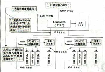 可實(shí)現(xiàn)高效的兩級組播;诳臻g總線上的組播信元技術(shù)實(shí)現(xiàn),與組播用戶數(shù)無關(guān),同一節(jié)目即使所有用戶加入該頻道,僅需復(fù)制一份,不用逐個用戶復(fù)制到每個用戶端口,極大節(jié)省了背板帶寬,減輕IP上行負(fù)擔(dān)?蓪(shí)現(xiàn)高性能硬件組播轉(zhuǎn)發(fā)。IP上行板采用超大規(guī)模FPGA硬件邏輯處理組播報文,ADSL板采用空間組播處理硬件芯片自動完成向每個ADSL端口(用戶)的組播復(fù)制,每ADSL端口組播帶寬6M。