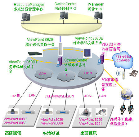 華為公司針對企業(yè)多媒體通信的實(shí)際需求,推出了高清晰視訊系統(tǒng)多媒體視訊通信解決方案,系統(tǒng)的組網(wǎng)結(jié)構(gòu)如下圖: