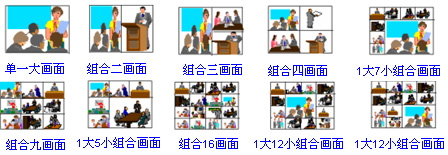 華為高清視訊系統(tǒng)采用了數(shù)字多畫面合成技術(shù),系統(tǒng)全面提供2、3、4、6、8、9、13、16等不同的9種畫面組合模式,在會議過程中,多畫面的格式可以通過主席或管理員隨意切換,同時會議過程中也可以在單多畫面之間的自由切換。支持的多畫面組合模式如下: