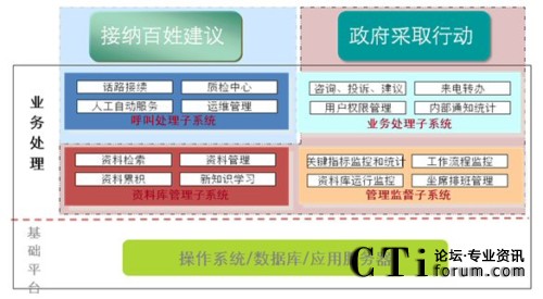 在架構(gòu)設(shè)計上,從電話接入、辦件流程、資料庫管理、信息維護(hù)到報表統(tǒng)計都實(shí)現(xiàn)了一體化設(shè)計理念。以業(yè)務(wù)流程設(shè)計為例,針對市民來電中的咨詢類的問題,12345政府熱線將直接由前臺接聽人員利用各部門預(yù)先錄入資料庫中的規(guī)范答案來回答市民的提問;對市民反映、建議、投訴類的來電,則由前臺記錄后轉(zhuǎn)給市信訪辦的后臺工作人員處理。一整套開放性的工作流和穩(wěn)定的技術(shù)后臺支持確保了市民可以在規(guī)定的時間內(nèi)得到政府的權(quán)威處理與回復(fù)。