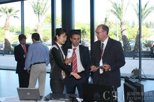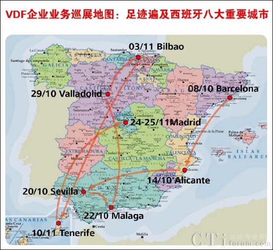 Vodafone 09企業(yè)業(yè)務巡展是Vodafone攜手10家重要合作伙伴和28家SP針對西班牙企業(yè)用戶舉行的一個大型巡展,整個展會歷時兩個月,以西班牙的經濟文化中心Barcelona為起點,途徑Alicante、Sevilla、Malaga、Valladolid、Bilbao、Tenerife,最后于11月24-25號在西班牙首府Madrid隆重謝幕。共有1萬多人、五千多家企業(yè)參加了本次展會,受邀企業(yè)覆蓋到金融、貿易、電信、交通、建筑、服務、醫(yī)療保健等重要行業(yè),其中大都為移動辦公需求旺盛需要保持實時協(xié)同的中小型企業(yè)。展會期間,華為歐洲地區(qū)部多位高層領導親臨展會現場指導工作,包括Vodafone系統(tǒng)部副總Edward Chan和張文林、代表處代表謝新平、歐洲軟件業(yè)務部領導林劼。領導們和客戶親切交流,并廣泛了解了其他SP展出的多項創(chuàng)新業(yè)務。