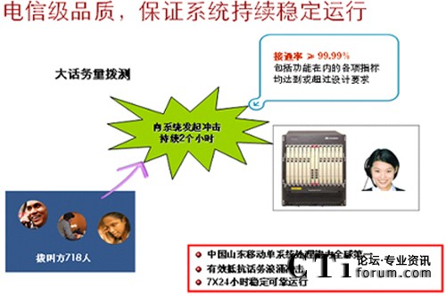 華為聯絡中心系統具有高穩(wěn)定性、高可靠性、易擴展性和可維護性。這主要源于華為對電信網絡現狀與演進的理解,源于華為擁有固定、移動和IP三個網絡方面綜合實力。華為數以千計的核心平臺開發(fā)測試人員,幾十種極端環(huán)境(如超大話務量、溫差、濕度、鹽堿度、缺氧等),磨礪出的是世界級的高品質。麥加朝圣10KM內密集200萬移動用戶,大部分為國際漫游,整齊劃一的用戶行為,形成連日多波話務尖峰,網絡受不均衡沖擊,系統容易雪崩。使用華為方案STC連續(xù)四年征服HAJJ期間話務高峰,告別系統每逢朝圣就癱瘓歷史。正是繼承了這樣的DNA,我們在某移動運營商聯絡中心系統單點實測BHCC1200K,每天平均呼叫量為600萬次,一套系統支撐著2000多座席和近8000路IVR。