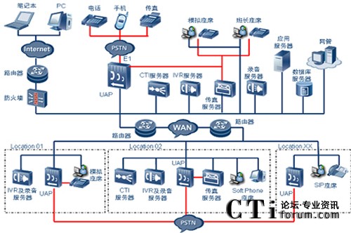 華為多媒體聯絡中心提供完善的分布式組網及集中式組網功能,可以提供分布式接入、分布式IVR、分布式錄音系統、分布式坐席、分布式傳真系統及網絡呼叫中心技術。如果各個分支機構有較多本地化業(yè)務需求的時候,各個分支機構只需要再配置一臺CTI服務器,就可以升級成完整的聯絡中心系統,可以單獨開展豐富的個性化業(yè)務。如果總部再安裝一套網絡呼叫中心,則可以實現聯絡中心的互連,即網絡呼叫中心。